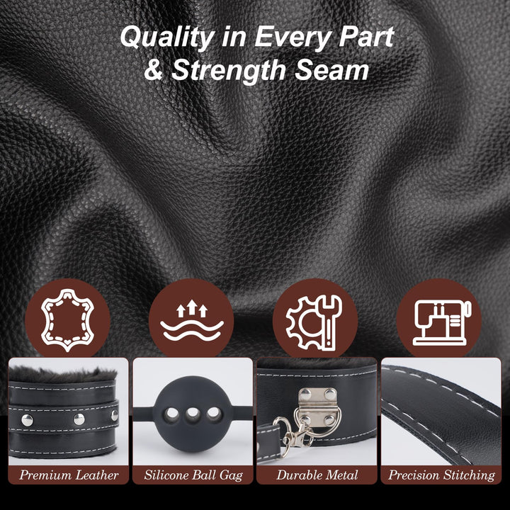 Includes silicone gag, faux-leather cuffs, and reinforced stitching for safety, comfort, and long-term use.